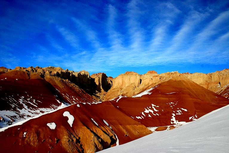 吉拉大峡谷位于准噶尔盆地的腹地,北距福海县城250公里。吉拉大峡谷东西长100余公里,如同一只巨大的喇叭筒,由东向西敞去。峡谷南地形高差不大,为沙漠起始,延展出去便是雄浑广袤的古尔班通古特大沙漠;峡谷北地形高差大,水切深,多陡崖,颜色分层明显,自上而下是石青、赭红、鹅黄、朱红。峡谷一线展开,气势宏大,堪称中国最大的雅丹地貌带。吉拉大峡谷远古为海底,随处可见的大海贝化石和各类大型古生物化石足可证明。