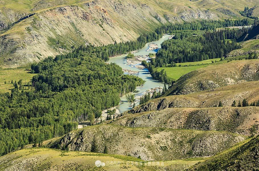 沿着木栈道一直往下走,越靠近河谷地带,风景越发别致迷人。中哈两国的界河——阿克哈巴河就在这峡谷里悠悠流淌。“阿克”在哈萨克语中意为“白”,因此阿克哈巴河也叫“白哈巴”。