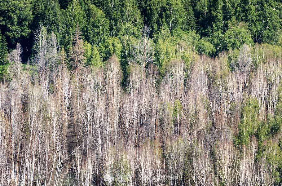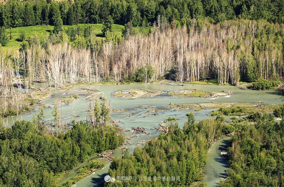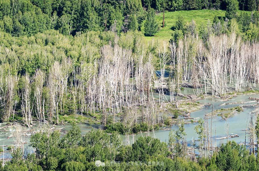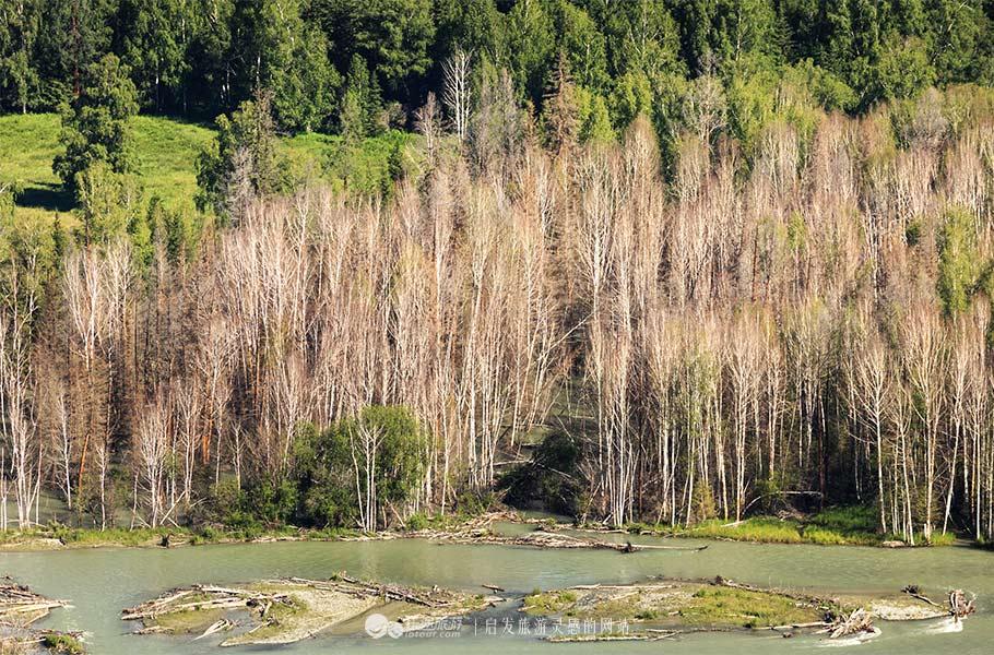 阿克哈巴河从河边,到河洲,到处都是白桦树颀长优雅的身影,奶油绿的河水就像一个调皮的娃娃,在这密密麻麻的树林中穿梭嬉戏。